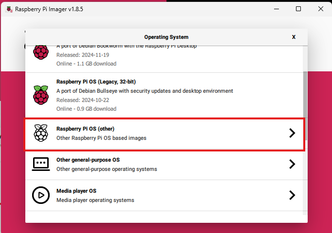 - Click “Choose OS” → Scroll down and select “Raspberry Pi OS (other)”.