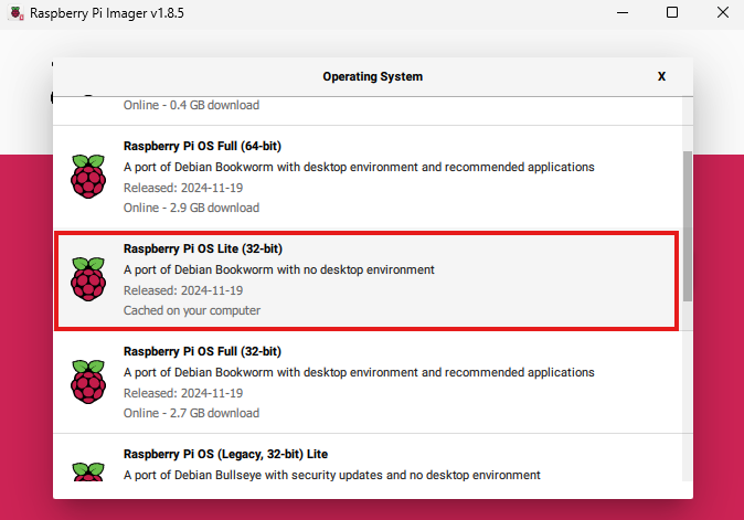- Select “Raspberry Pi OS Lite (32-bit)” (a minimal, non-GUI version).