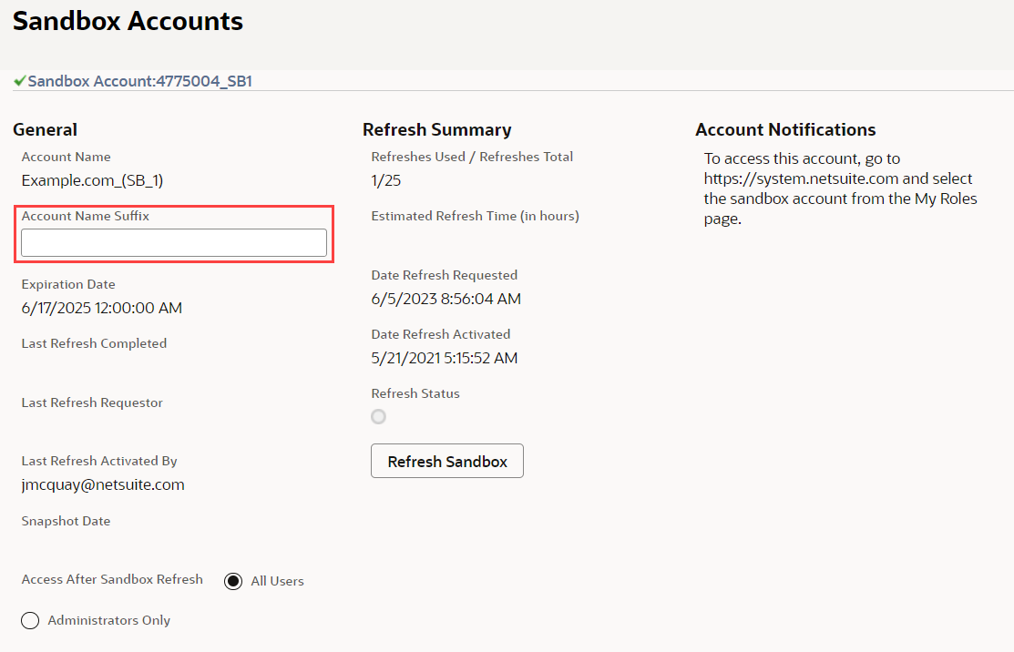 Administrators have the option to add a suffix to the sandbox account name before every refresh or copy data to sandbox and before every activation. This option helps users differentiate between multiple accounts. After entering the desired text for the suffix, to submit the request for a sandbox refresh, click Copy Data to Sandbox or Refresh Sandbox. The option appears again when the account is ready for activation. Enter the desired text for the suffix, then click Activate Sandbox. The suffix is appended to the account name and appears in the Account Name field after the refresh is complete and the account is activated.
