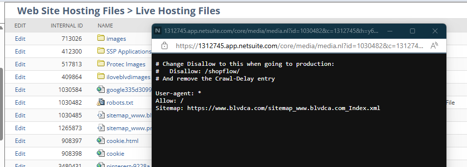 robots.txtfile as described in Editing Files in the File Cabinet. - Add the sitemap index file name in the following format: