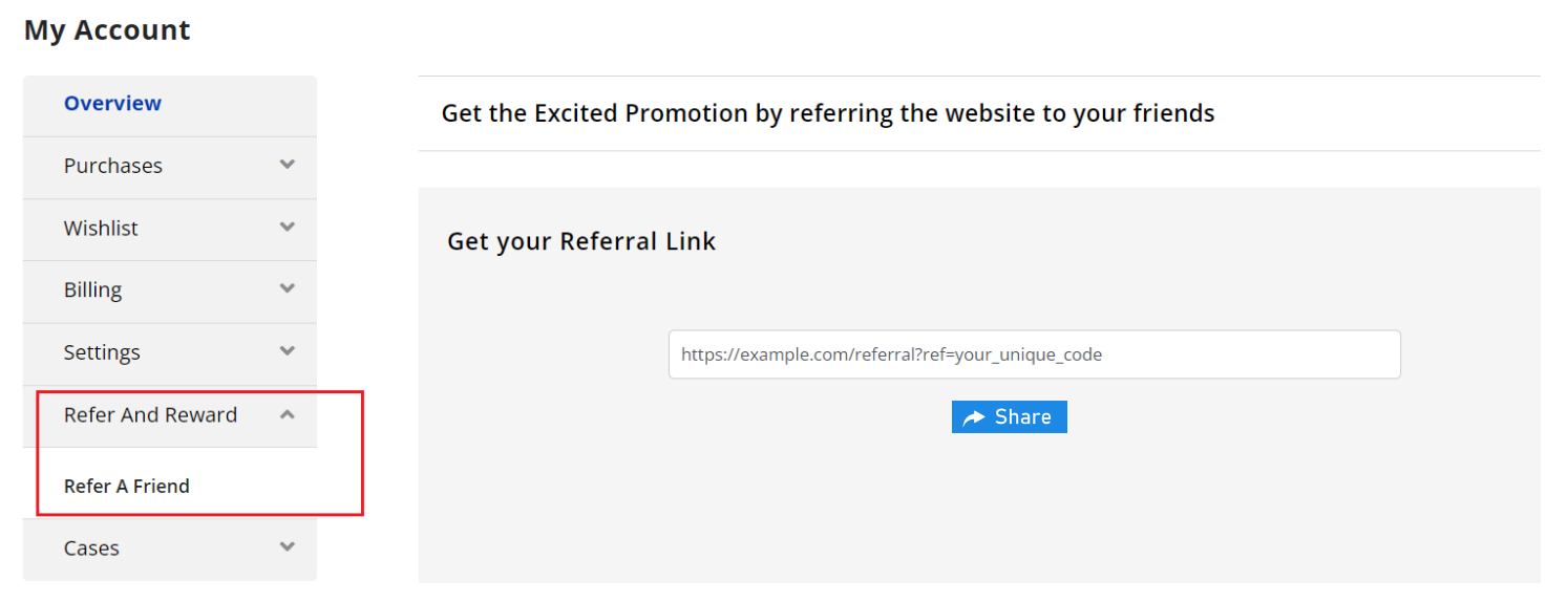 - On this page, display a unique referral link associated with the logged-in customer. This link will contain their unique ID.