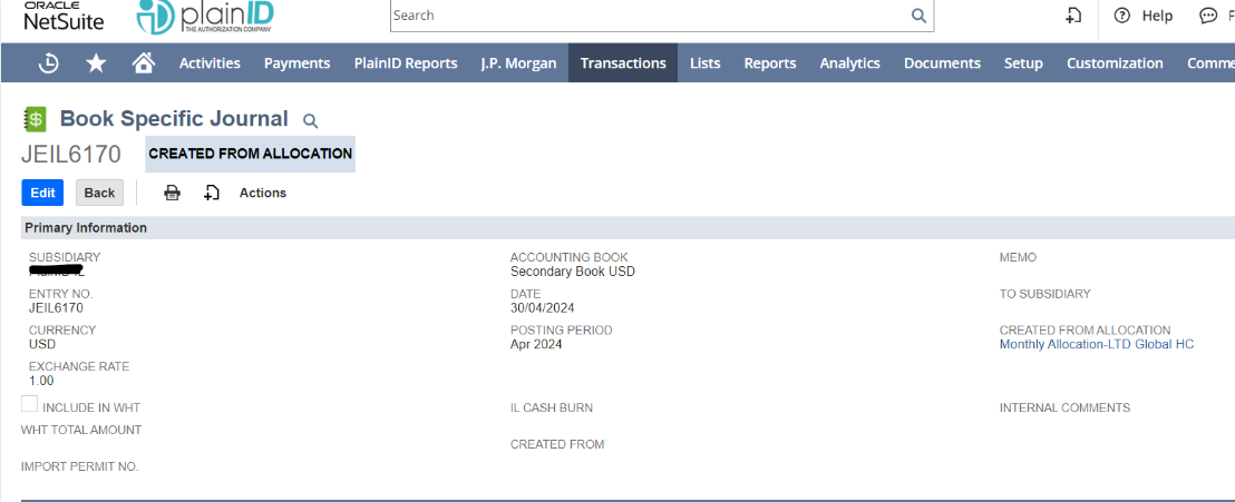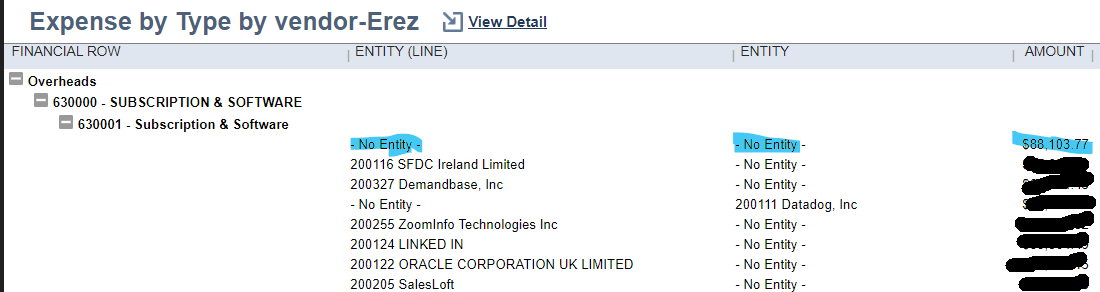 When we run and post allocation schedules, the process works on all related invoices and performs credit and debit on the related department with the allocation schedule. The issue is that it does that without bringing in the vendor’s name. What happens is that when we try to analyze our P&L by vendor spending, we get 1 big line of “No entity,” which consists inside of all allocation jJ.Es scedules in that card.