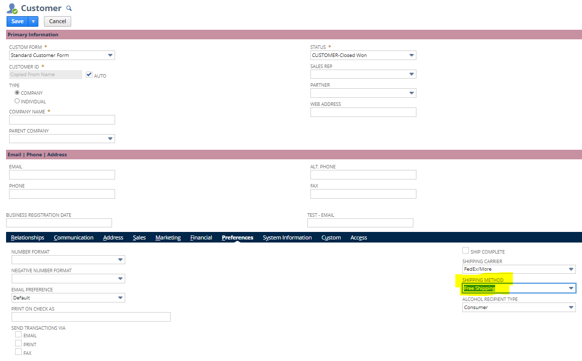 1. Go to the Customer Record > Preferences subtab > Shipping Method.