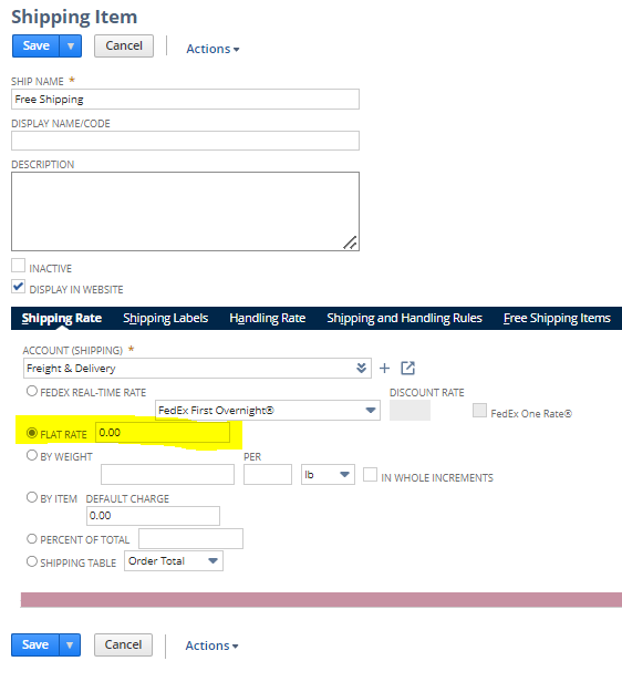 3. If you don’t have a Shipping Method that has no shipping cost, you can create one through navigating to Lists > Accounting > Shipping Items > New
