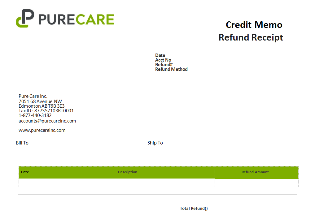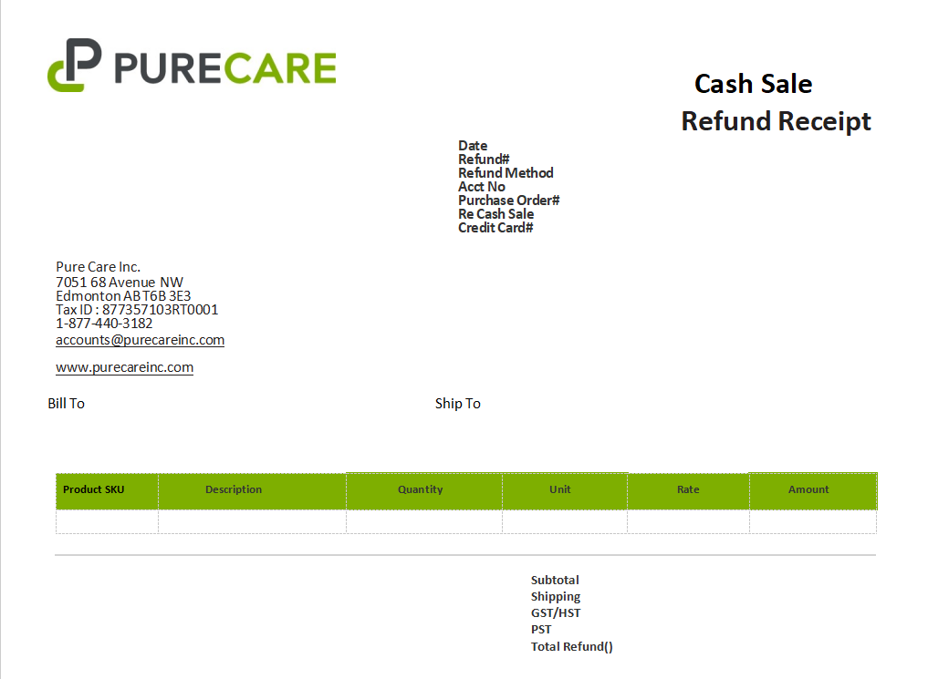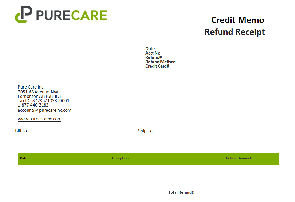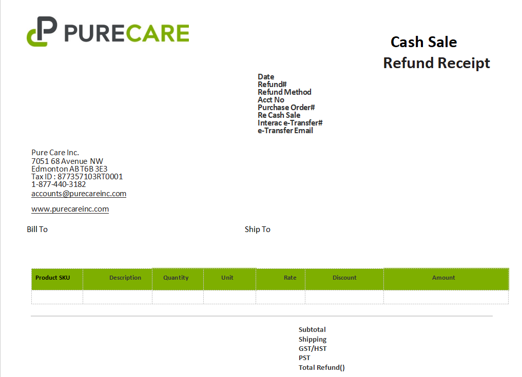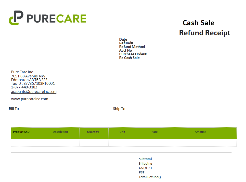 - The Cash refunds by all other methods, which is the same as the corresponding ones attached, but without showing: credit card number, e-transfer number, or e-transfer email. The refund method will pull in the selected refund method. The PDF will print like,