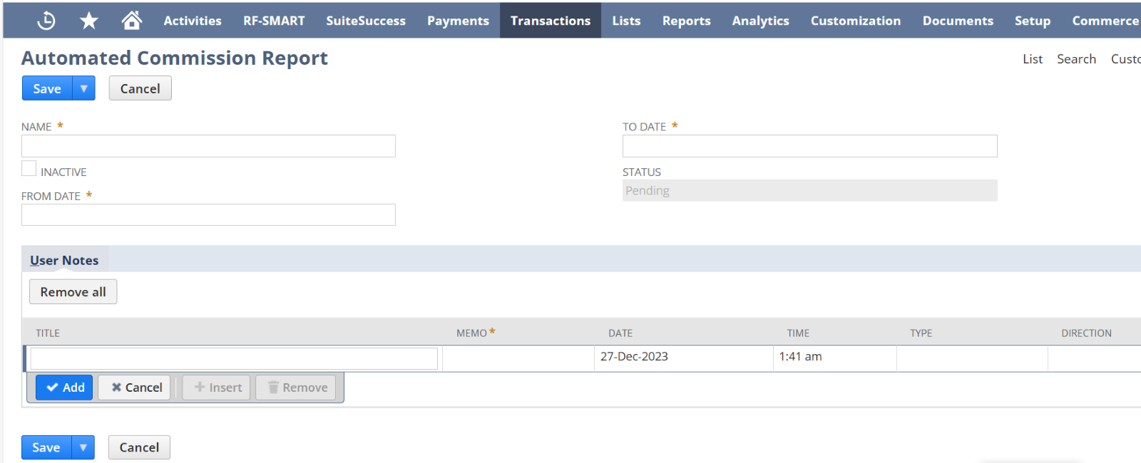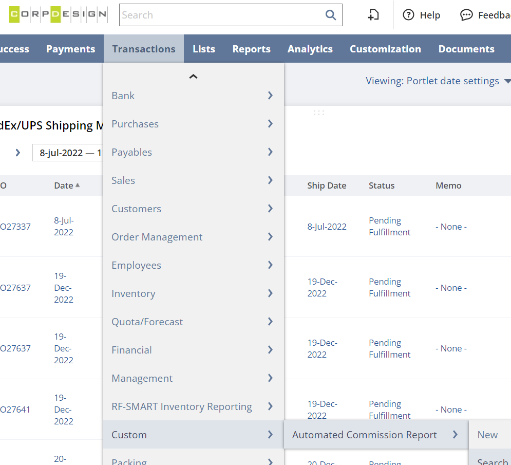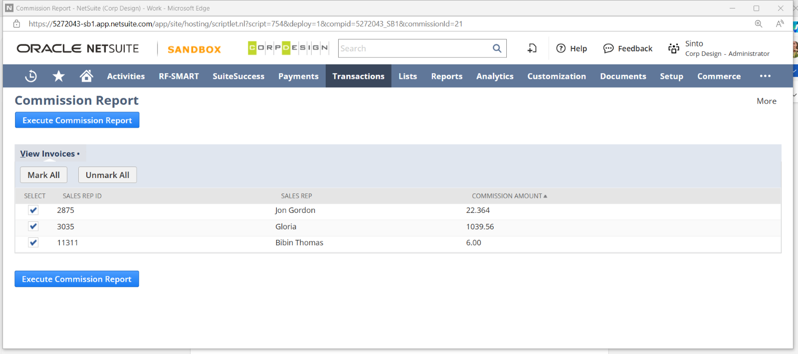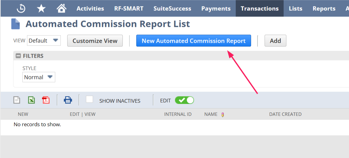 Transaction –> Custom –> Automated Commission Report