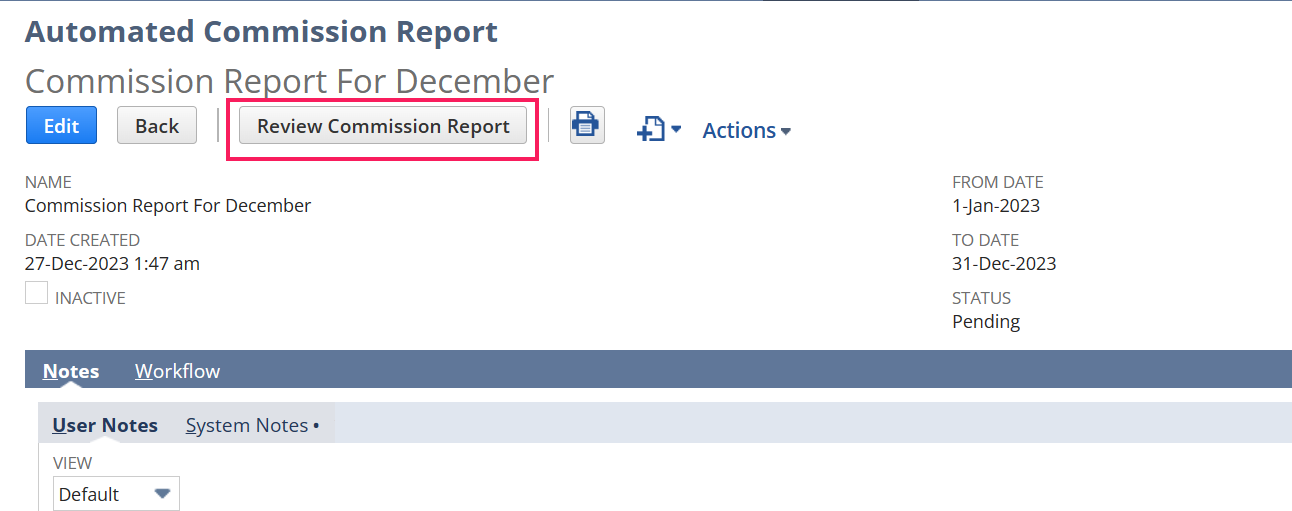 - Once this custom record is saved after entering the details, we can see a button named ‘Review Commission Report’.