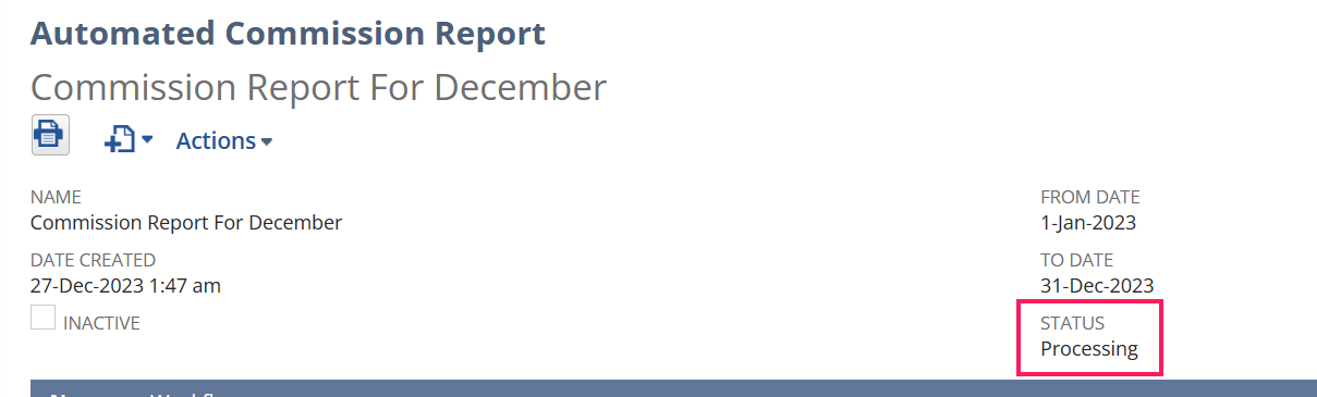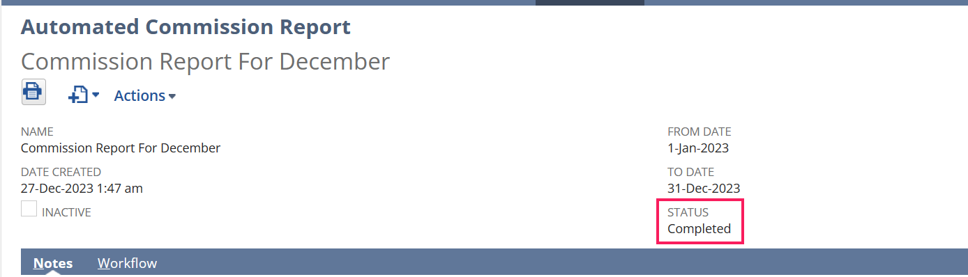 - To flag such invoices, the custom checkbox field on invoice named ‘Commission Report Sent’ will be mark checked once the report is sent to sales rep.