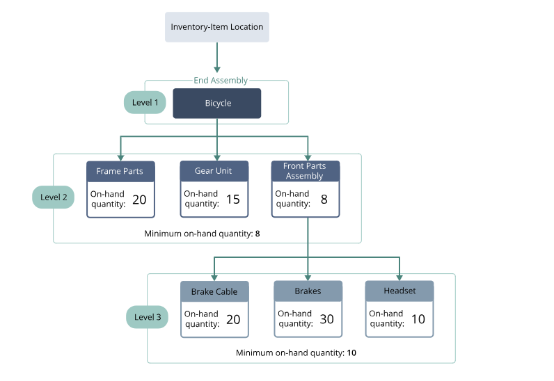 - Minimum on-hand quantity at level 1 (L1) = 8 (based on Front Parts Assembly)