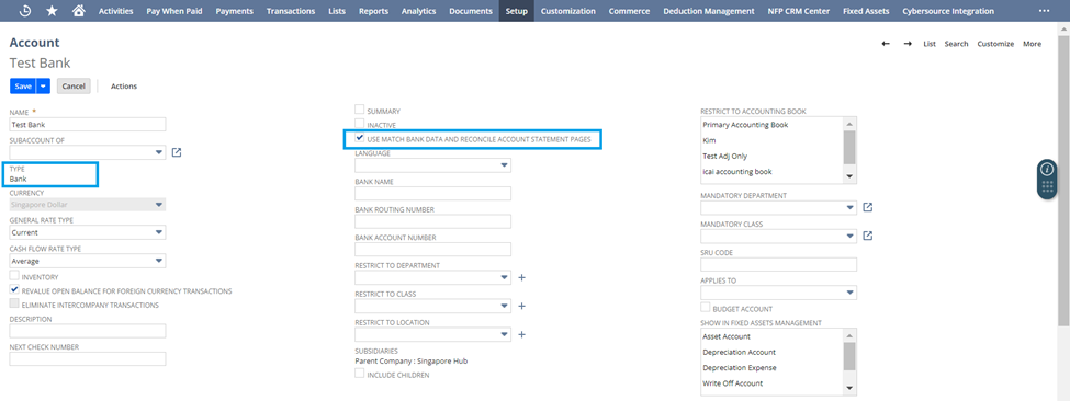 NetSuite provides an application that simplifies the reconciliation process for users utilizing Match Bank Data and Reconcile Account Statement. These processes work hand in hand to enhance the bank reconciliation process, ensuring that users achieve the results they expect. To utilize this feature, one must first establish General Ledger Account, specifically designating them as either a Bank or Credit Card Account Type. This step is a prerequisite for accessing the functionality provided by the checkbox feature. More of this is documented on SuiteAnswer 101099 | Editing Accounts to Use the Match Bank Data and Reconcile Account Statement Pages.