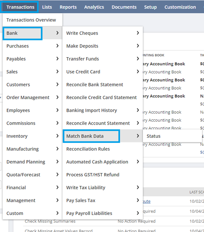 As soon as your Bank or Credit Card Accounts are setup, you may now access Match Bank Data, by navigating to Transactions > Bank > Match Bank Data.