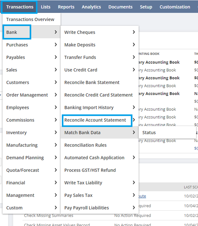 After you submit your matched transactions, you are now ready for Reconcile Account Statement. Here, you can perform the actual reconciliation process seamlessly! To get started, you may navigate to Transactions > Bank > Reconcile Account Statement.