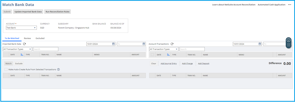 In addition to reconciliation, Match Bank Data also lets users record transactions in NetSuite that have already cleared the bank but have not yet been entered into the system. This feature ensures that all financial activities are captured promptly, providing a complete view of the organization’s financial standing.
