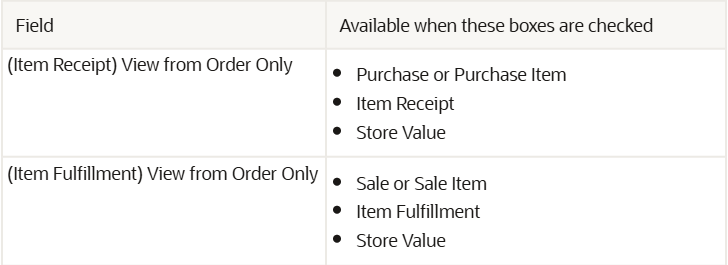 The Applies To subtab of transaction body and transaction line custom fields have settings for Item Receipt and Item Fulfillment fields. These settings have associated View from Order Only fields. Checking a View from Order Only box does the following:
