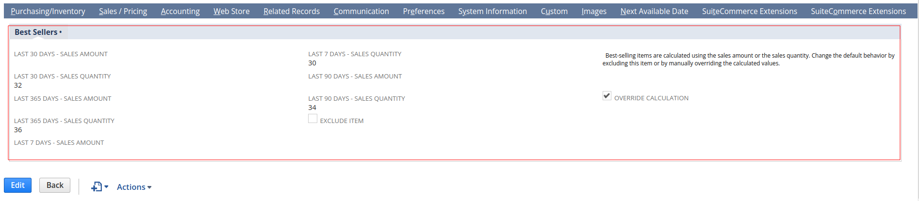 – After installing the bundle, below fields are added to item record in the SuiteExtensions tab, Best Sellers subtab