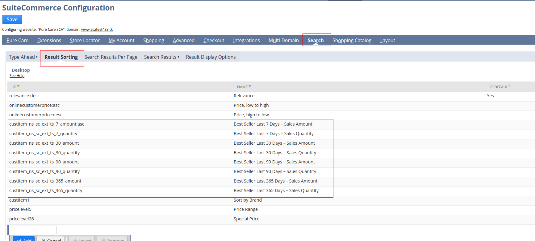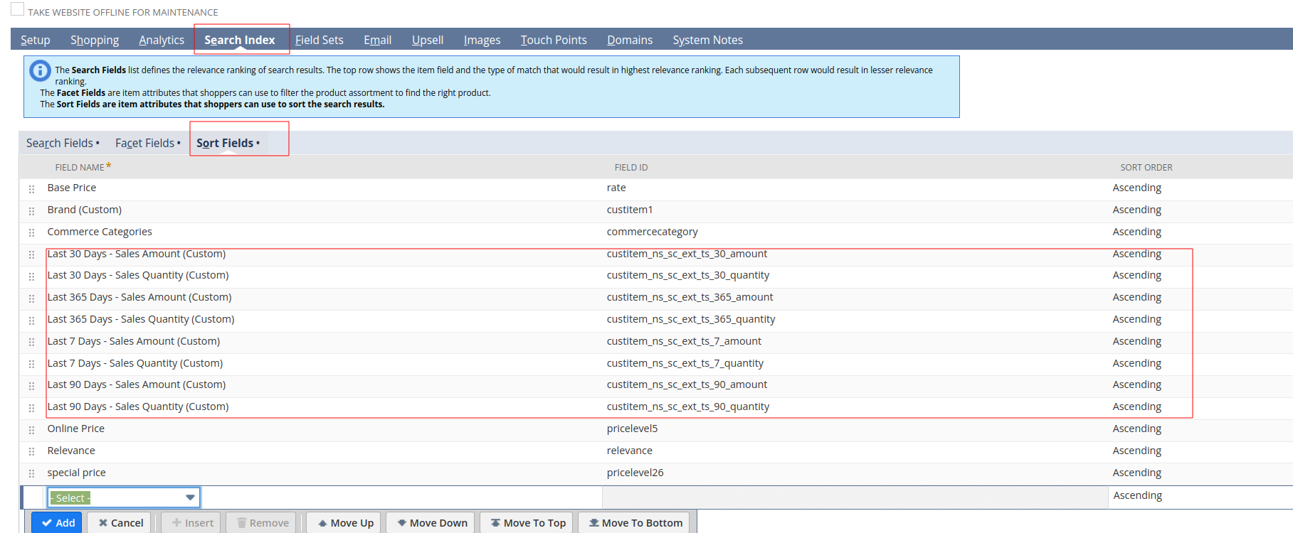 custitem_ns_sc_ext_ts_30_amount:ascfor best sellers from the last 30 days, sorted in ascending order. - Enter the text you want to display for the sort option in the Name field and click Add.