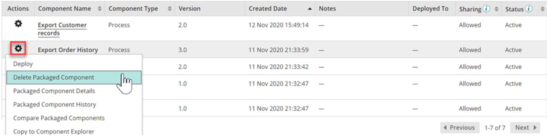 - From the list in the Packaged Components page (Deploy > Packaged Components), locate a version of a packaged component that you want to delete.