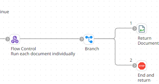 By utilizing a flow control shape to process each document individually, along with an end and return shape, we can halt the execution after handling the first document.