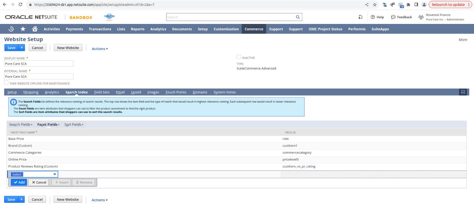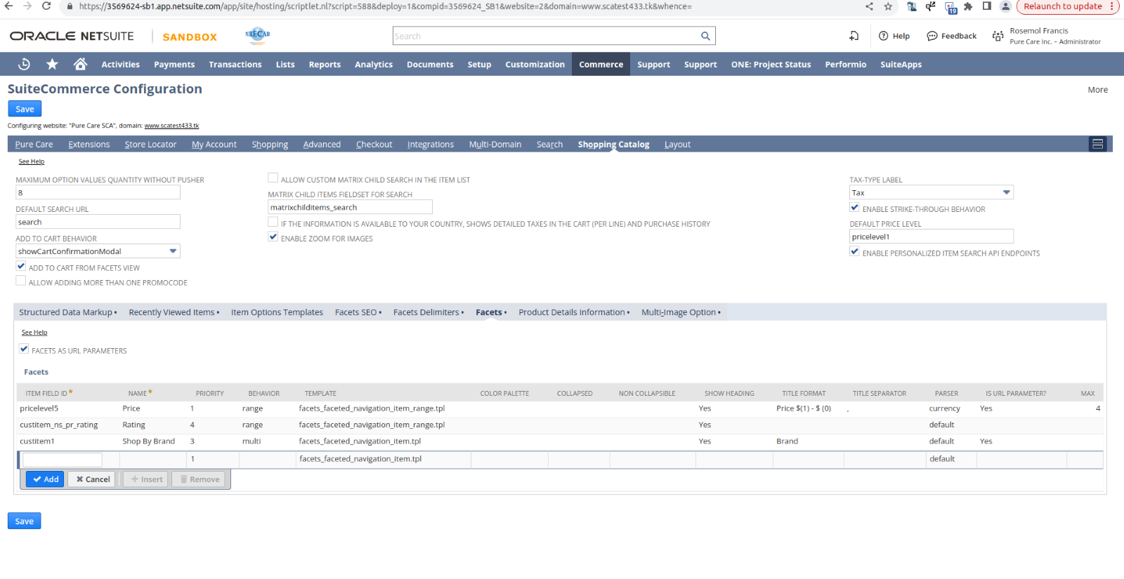 In configuration added the brand facet. In facets subtab added the brand field ID , name, priority, behvior etc.