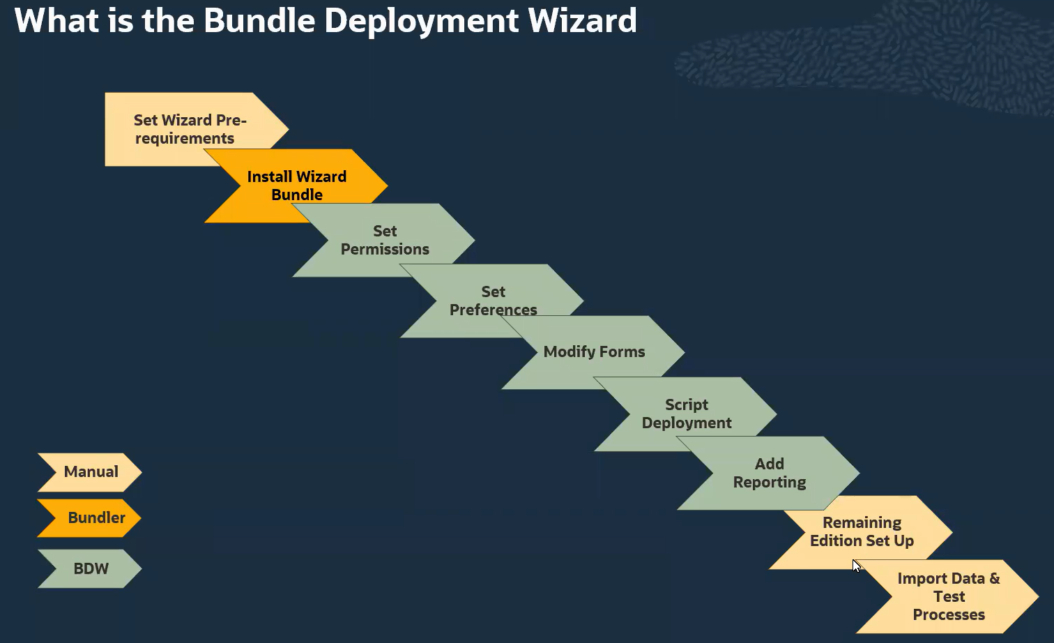 The Bundle Deployment Wizard (BDW) is designed to automate the required configuration of SuiteSuccess and PSG SuiteApps that occur as part of every SuiteSuccess implementation. The deployment and configuration of the included SuiteSuccess and PSG bundles will be driven by a configuration file uploaded into the Bundle Deployment Wizard. Once the deployment automation is completed, the results of the automation will be displayed to the end user within the NetSuite UI alongside documentation for completing the last manual steps.