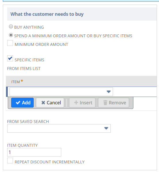 When you create an item promotion with specific item buy conditions, you can select the quantity of items that must be bought at full price to make the transaction eligible for the promotion. In such promotions, the discount is not applied to each eligible item, it is applied to the additional items added to the transaction after this quantity is met. For example, if a customer must buy one item at full price to get a discount on additional items and they have two of these items in their transaction, they will get a discount on one of these items. If they have four of these items in their transaction, they will get a discount on two. To determine which of the items is discounted you specify if the discount is applied to the cheapest or most expensive of the eligible items.