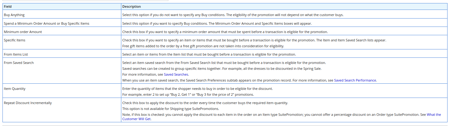 Buy conditions are the promotion’s eligibility rules that determine the transactions that qualify for the promotion. A promotion can only be applied to a transaction that meets the requirements specified by the eligibility rules.
