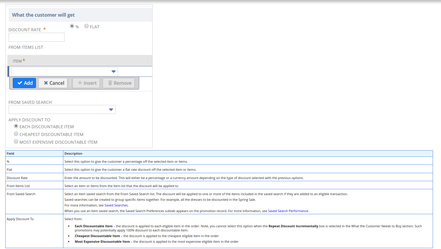 - Item Promotions – percentage or currency amount discounts are applied to items included in an order. These promotions create line-level discounts for each item defined on the promotion. s are available for a fixed promotional price. These promotions create line-level discounts for each item defined on the promotion.