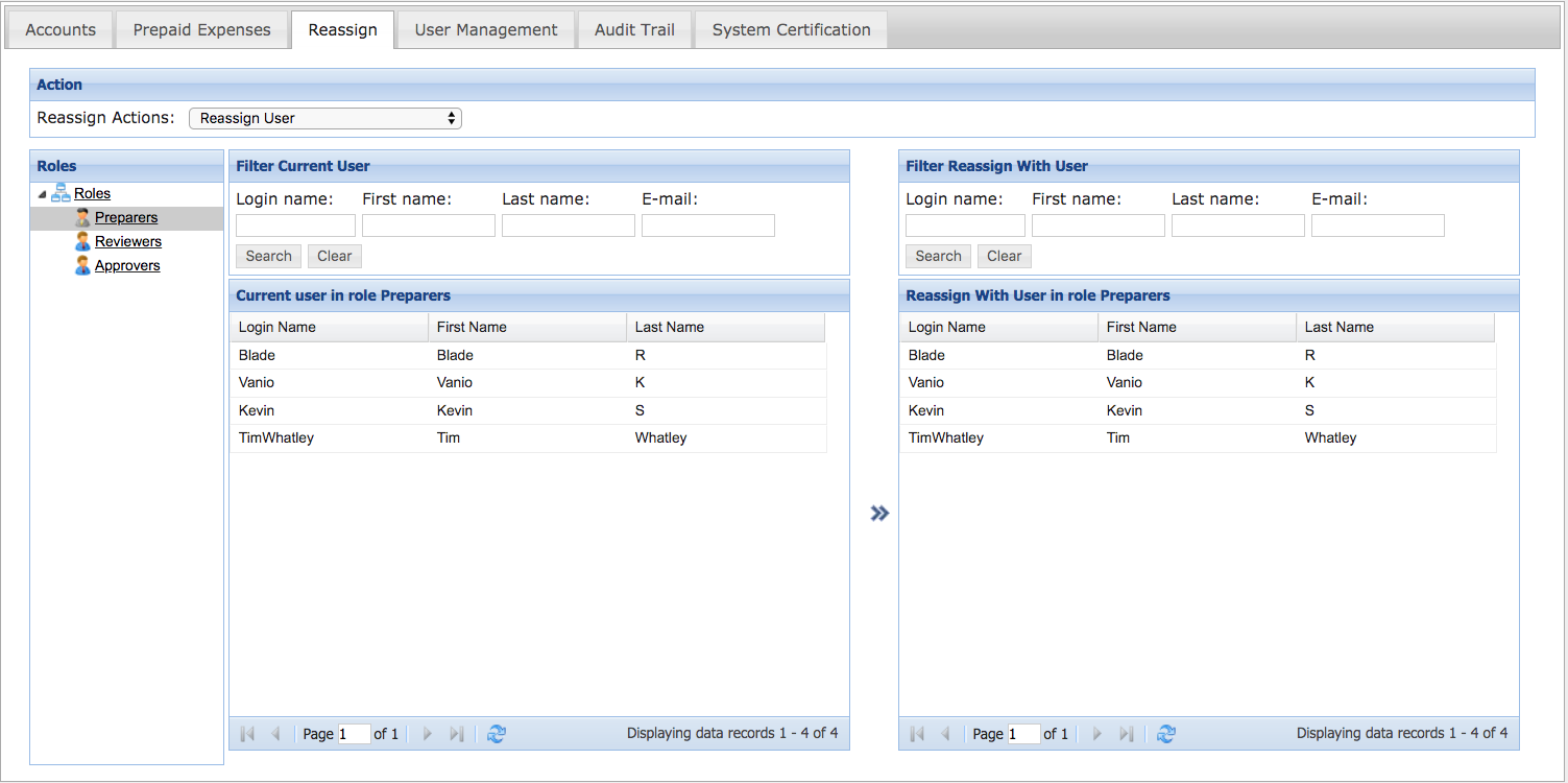 The reassign tab enables the Administrator to reassign all the accounts for which one user is assigned to another user in the same role, as well as manage the assignment of backup users. The system will prevent any role conflicts. For example: it is impossible to assign a user to be Reviewer of an account and period they are already Preparer for.
