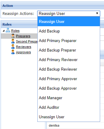 The reassign tab enables the Administrator to reassign all the accounts for which one user is assigned to another user in the same role, as well as manage the assignment of backup users. The system will prevent any role conflicts. For example: it is impossible to assign a user to be Reviewer of an account and period they are already Preparer for.