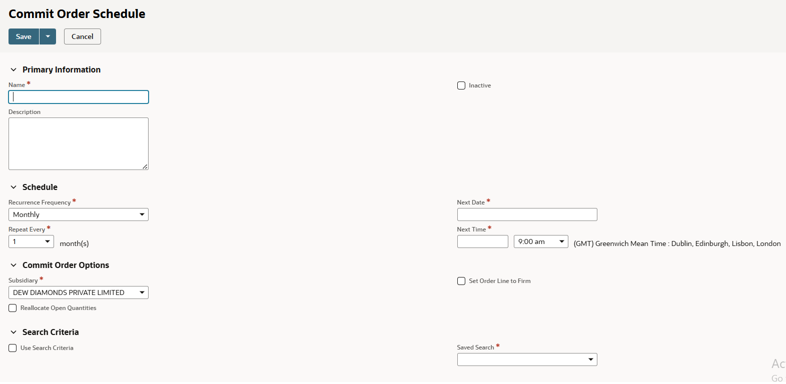To schedule the commitment of items to orders, search criteria can be defined to identify the types of orders to which items should be committed. After you set a schedule, items are committed at the scheduled time for that group of orders based on the search criteria.