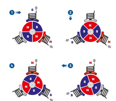 BLDC motors do not use brushes for commutation. Since the coils are static, there is no need of a mechanical commutator to energize the windings. Instead, the commutation is done electronically, usually via a microcontroller unit and semiconductor switches. Electronic commutation consists of a series of steps where current from an external drive circuitry is delivered to each phase coil in a controlled sequence, producing a proper motor rotation by magnetic interaction between rotor and stator. To achieve this in a three-phase motor, current flows into one of the windings, goes through a common node, and flows out from another, leaving a third one open circuit. That way, when a rotor pole is about to align with its electromagnetic counter-pole on the stator, this is turned off and the next phase turned on, which makes the rotating motion continuous.