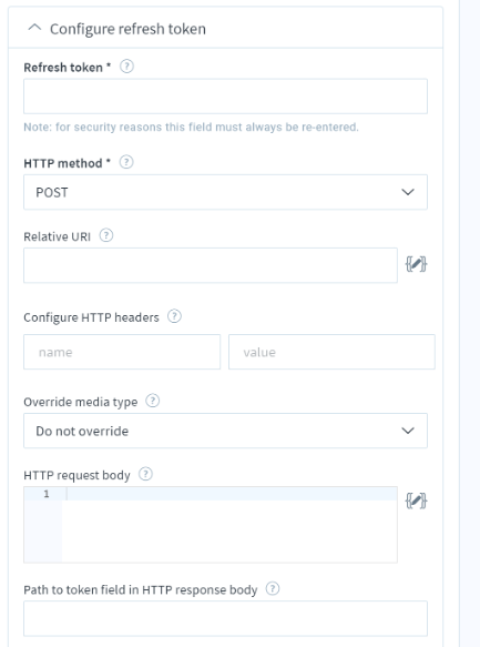 Refresh token (required): Enter a token that can serve as a refresh expired auth token. You can place this token in the body, headers or URL simply by referencing it with the handlebars placeholder {{connection.http.auth.token.refreshToken}}. Multiple layers of protection, including AES 256 encryption, are in place to keep your token safe. When editing this connection, you must re-enter this value each time; it is stored only when the connection is saved and never displayed as text. You can enter dummy token also here.