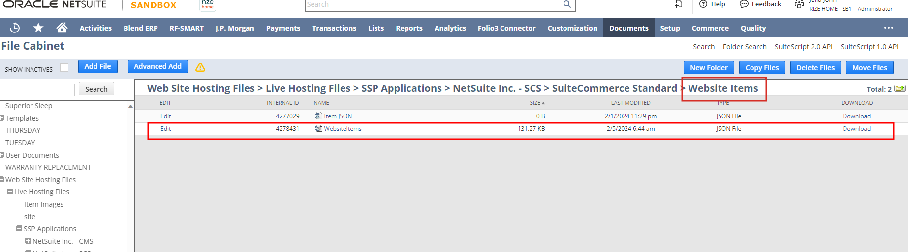 We can use a user event script to create the json file of complete items. Before that folder need to be added in the file cabinet to which the json file is created. When we add, delete or update the item record in NetSuite, the json file become updated.