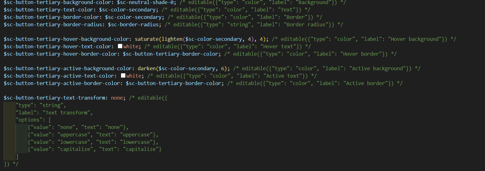 Type can be color, string.. The Label will be the text that will be shown on the SMT. Once the Variables are created we can assign them to the various SCSS files.