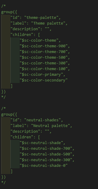 Once the variables are created, we can group them by adding the variables in the _grouping.scss. As shown below, the label will be the text that is displayed, and the variables declared as children will be grouped under the main tab.