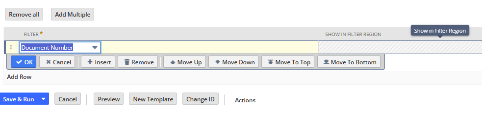 - Under the Available Filters tab, add the Document Number/ID field and check the Show in Filter Region checkbox