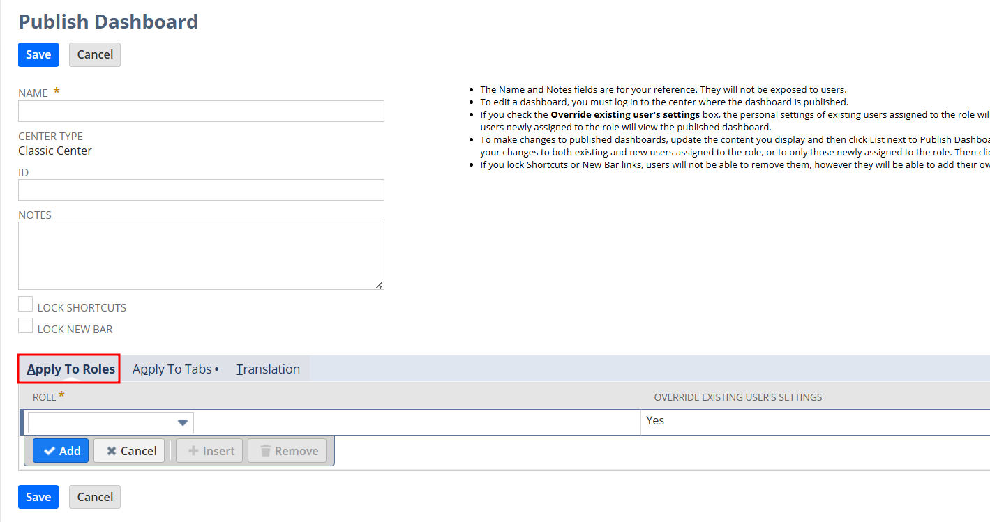 Under the Apply to Roles subtab we can give the roles to publish this dashboard.