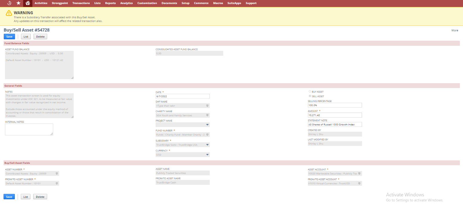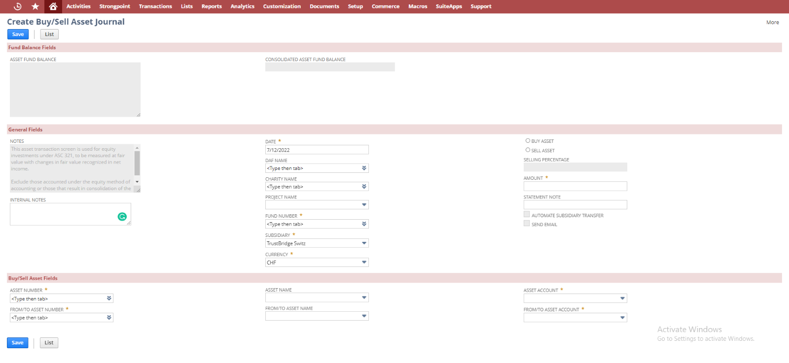 The create page of the Buy or Sell Asset screen is used to buy or sell assets from/to an entity (associated with a fund number). The fund number can be a DAF or a Charity or a Project fund number.