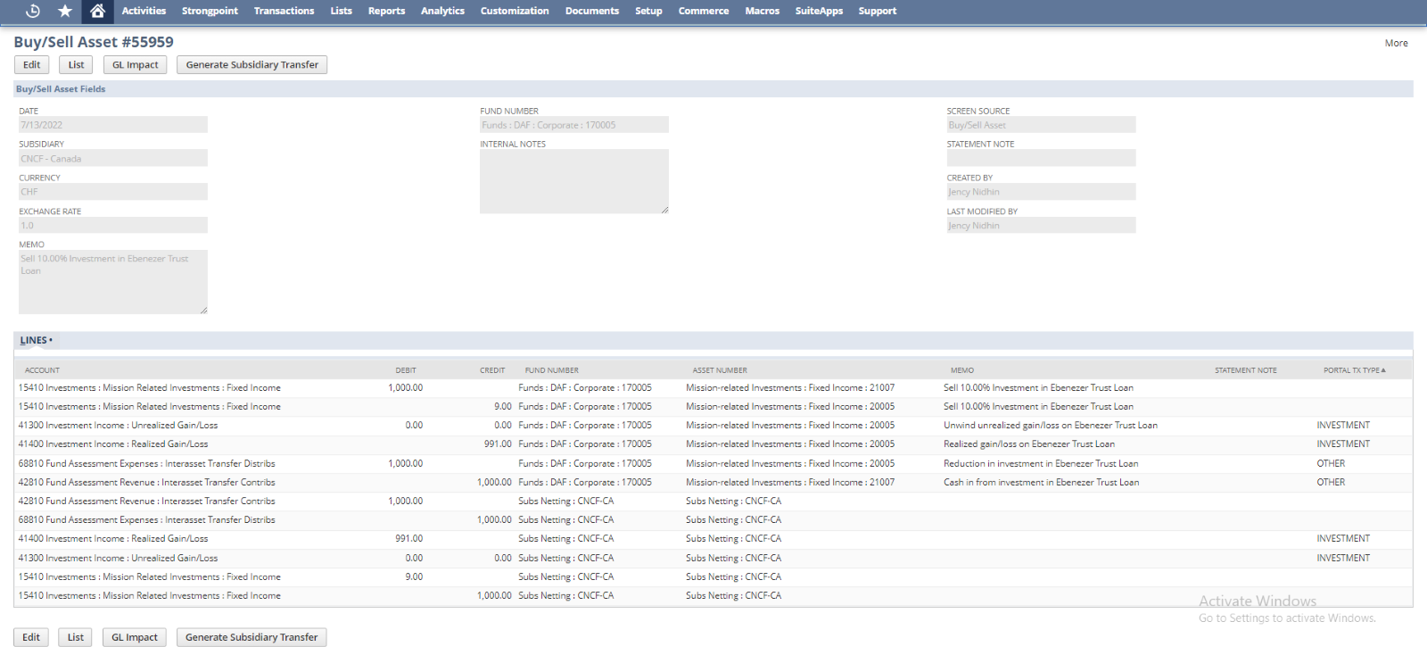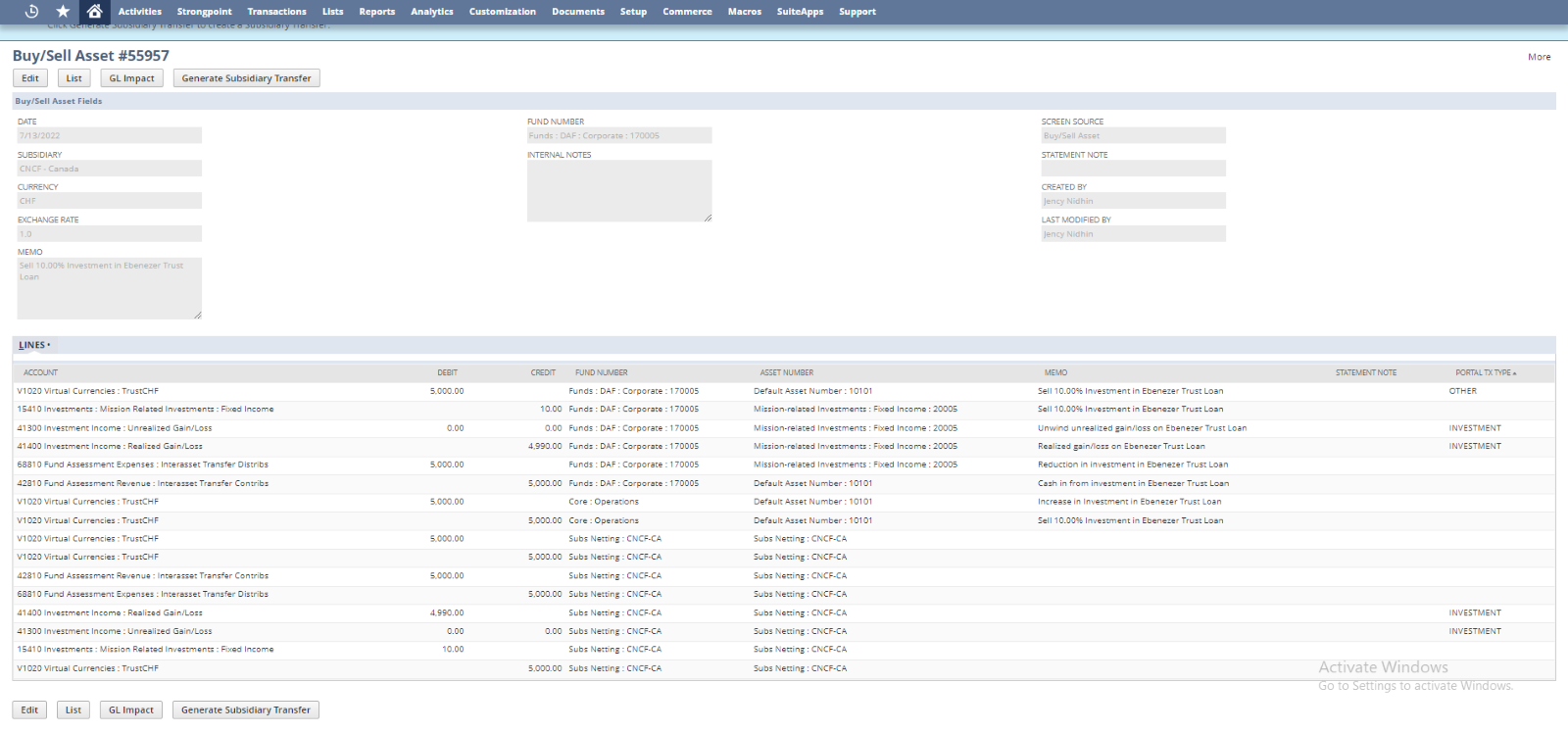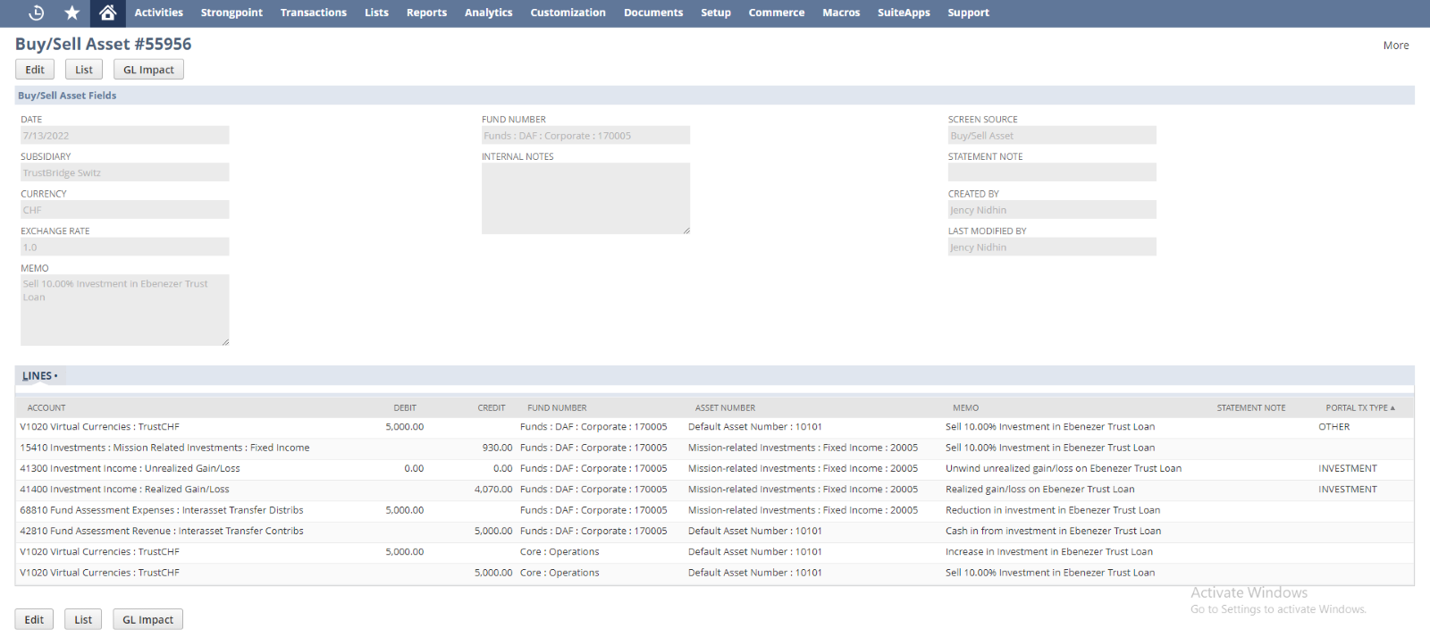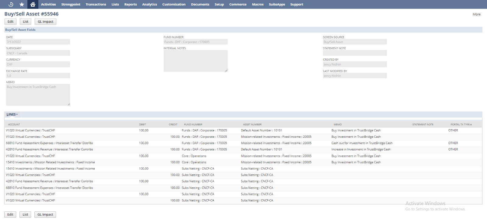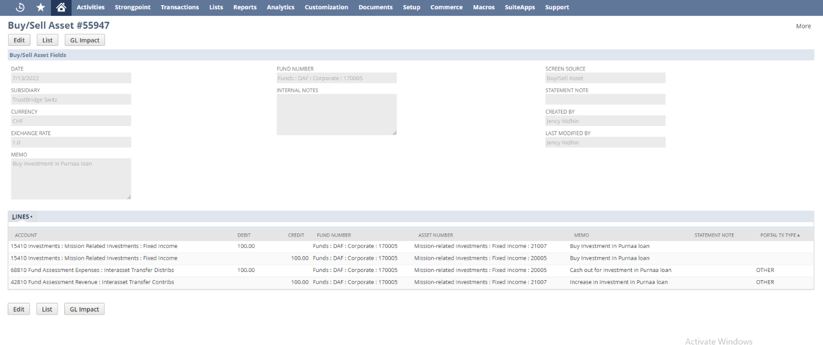 The view screen is used to view and verify the created asset buy or sell. Fields in the view screens are disabled, the user can view and verify the created asset buy or sell. Generally, the view screen shows the NetSuite journal record which is created from the Asset Buy or Sell, so that user can verify the line allocation and body fields and all from the view screen.
