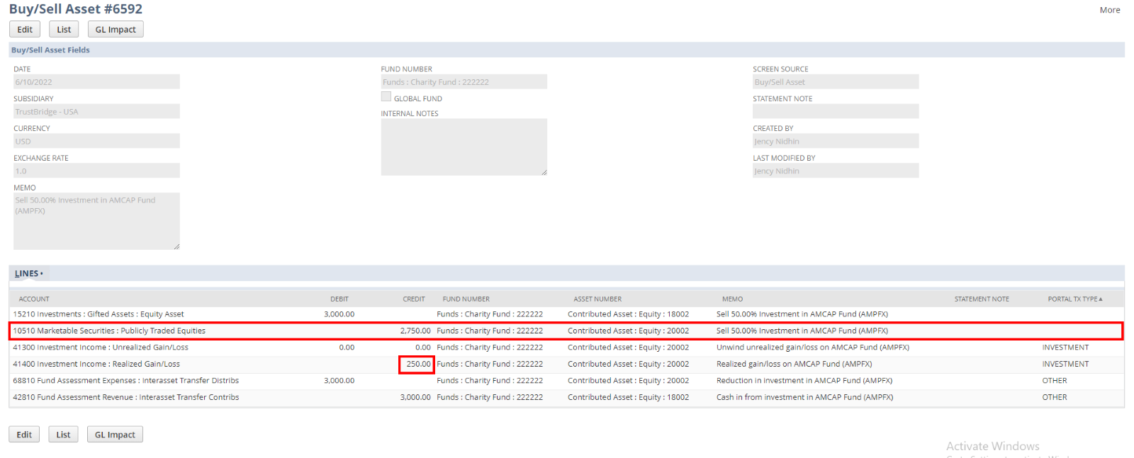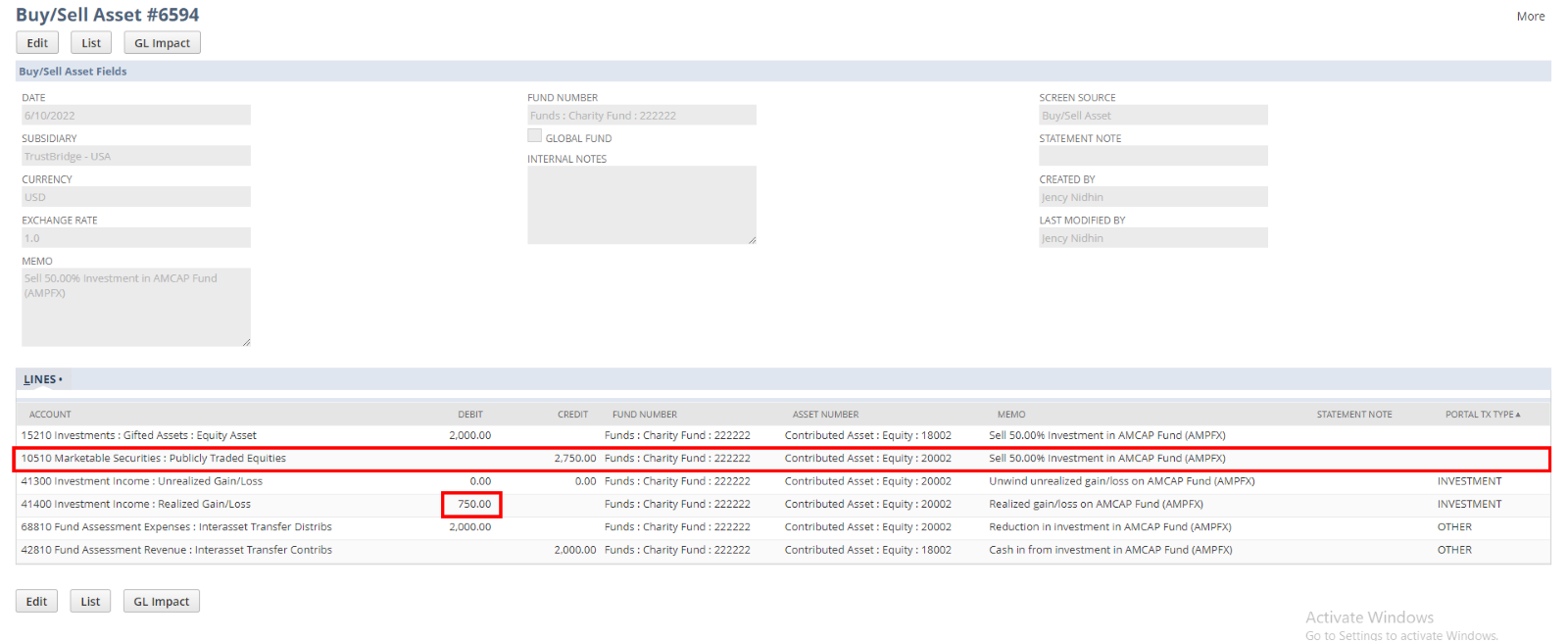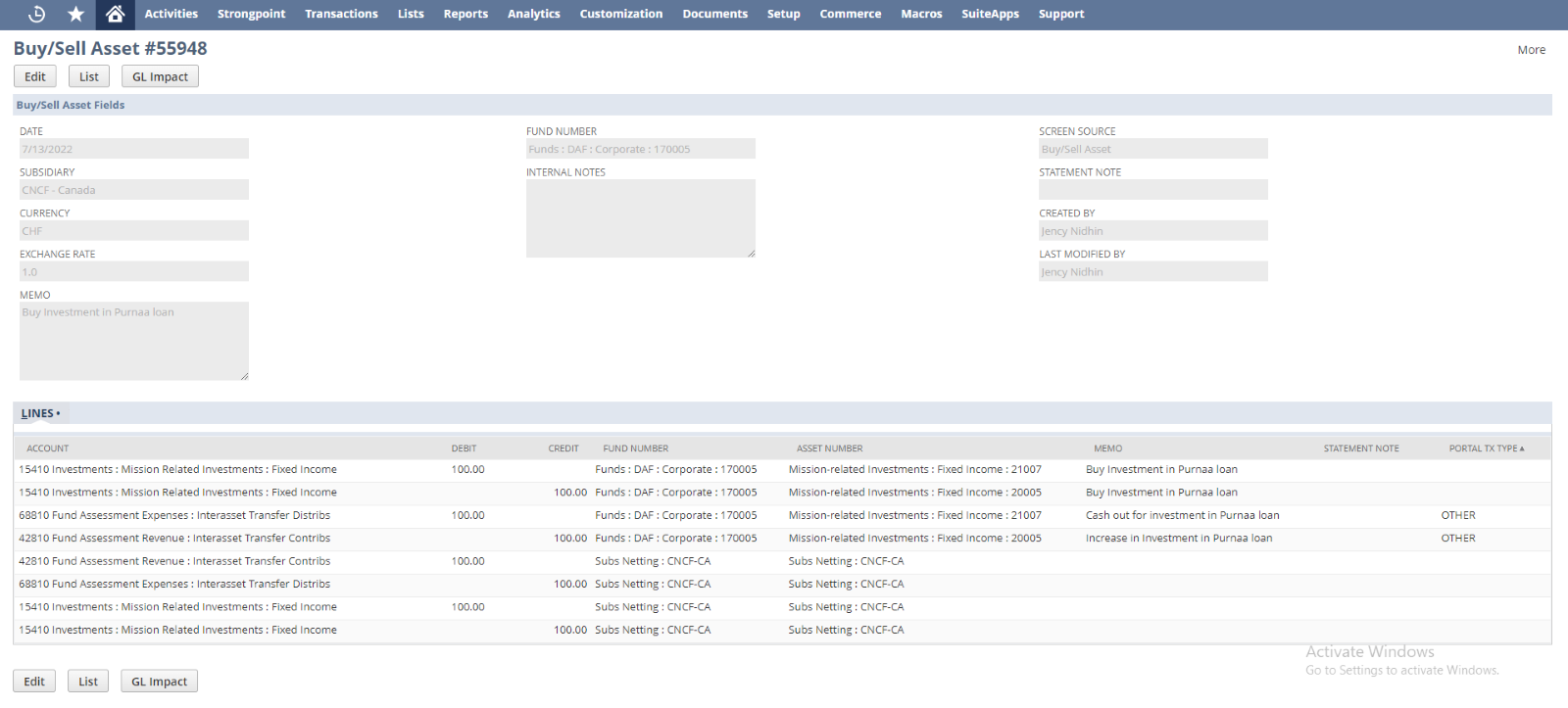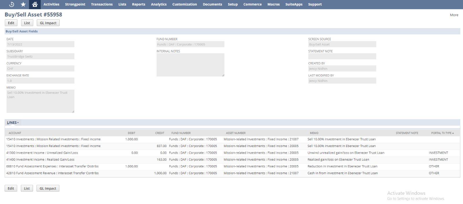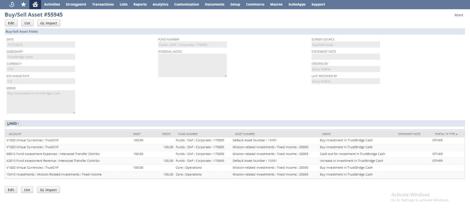 The view screen is used to view and verify the created asset buy or sell. Fields in the view screens are disabled, the user can view and verify the created asset buy or sell. Generally, the view screen shows the NetSuite journal record which is created from the Asset Buy or Sell, so that user can verify the line allocation and body fields and all from the view screen.