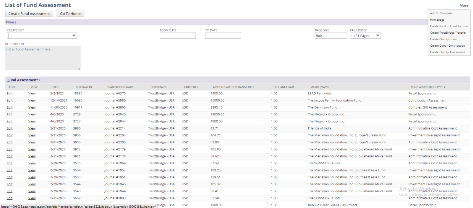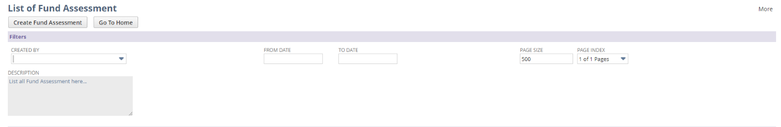 The list screen lists all the journal entries created from the Fund Assessment screen . Whenever user create a Fund Assessment, a journal entry is created based on the subsidiary/division hierarchy.
