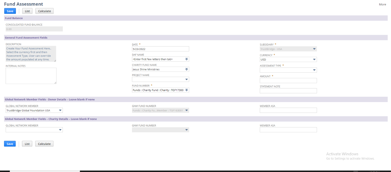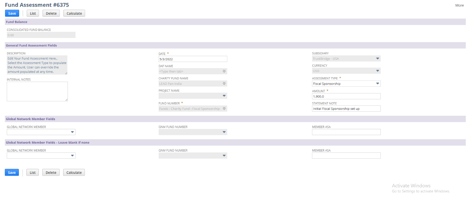This project/task briefs about the functionality of the Fund Assessment in DIAB instances. Fund Assessment is for manipulating various assessments from Donors or Charities or Projects. The assessments are Charity Application Assessment, Charity Renewal Assessment, Project Oversight Assessment, Foundation Services Assessment, Grant Assessment, Processing Assessment, Fiscal Sponsorship, Administrative Cost Assessment, Investment Oversight Assessment, Contribution Assessment, Investment Origination Assessment, Complex Gift Assessment, Inactivity Assessment.