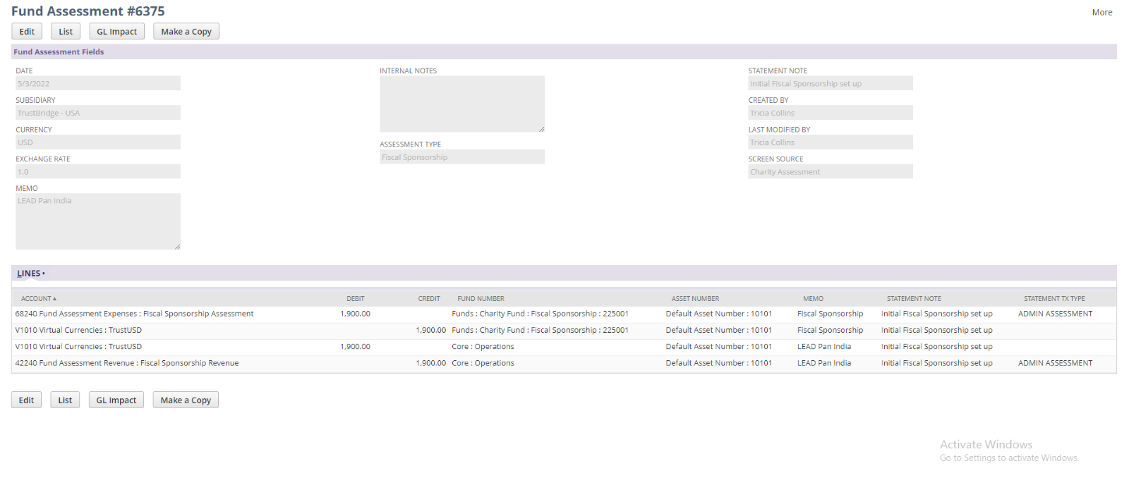 View screen is used to view and verify the created Fund assessment. Fields in the view screens are disabled. Generally view screen shows the NetSuite journal records which are created from the Fund Assessment screen so that the user can verify the line allocation and body fields from the view screen.