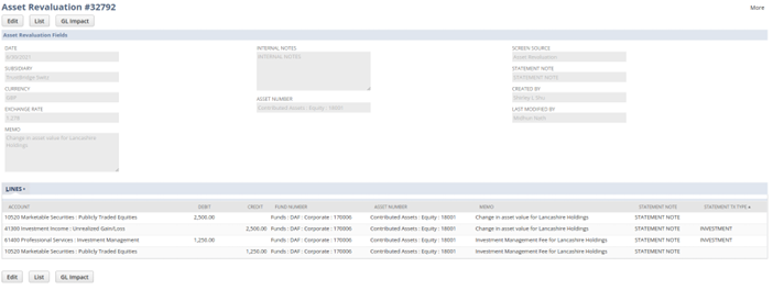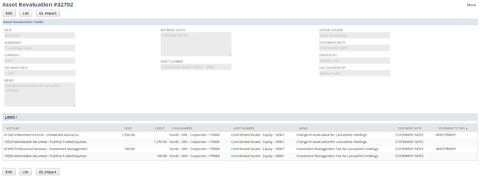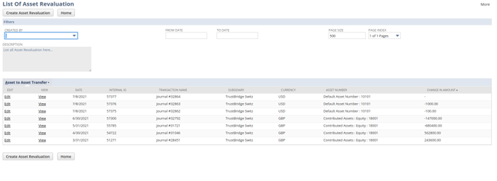 The view screen enables users to gain an understanding of the journal entries made in NetSuite from the Asset Revaluation screen. View screen of the Asset Revaluation screen reflects the journal entry created in NetSuite which shows the fund movement between the fund numbers.