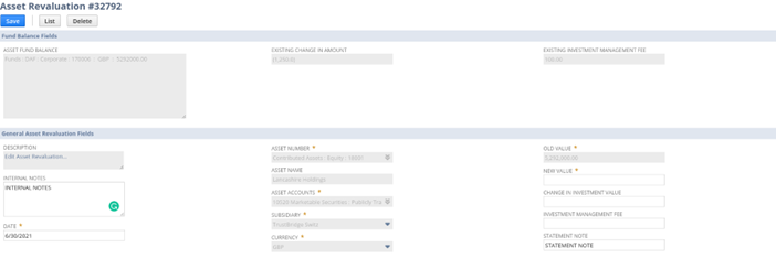 Existing change in value and Investment Management Fee are shown in the fund balance section. User always need to revalue the asset based on the new input in the New Value, Change in Investment Value, Investment Management Fee