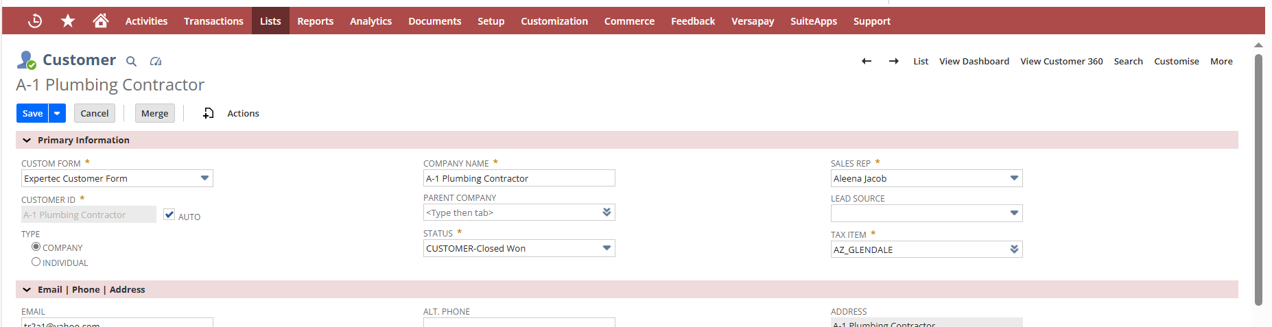 When you access a customer record in NetSuite, we can find the link to Customer 360 on right top of the page as in below: