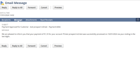 Body: We are pleased to inform you that your payment of €2,00 for your account 70 test prospect ind test was successfully processed on 05/01/2024 via your VISA ending in the last digits ************1111.