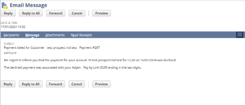 Body: We regret to inform you that the payment for your account 70 test prospect ind test for €2,00 on 05/01/2024 was declined.