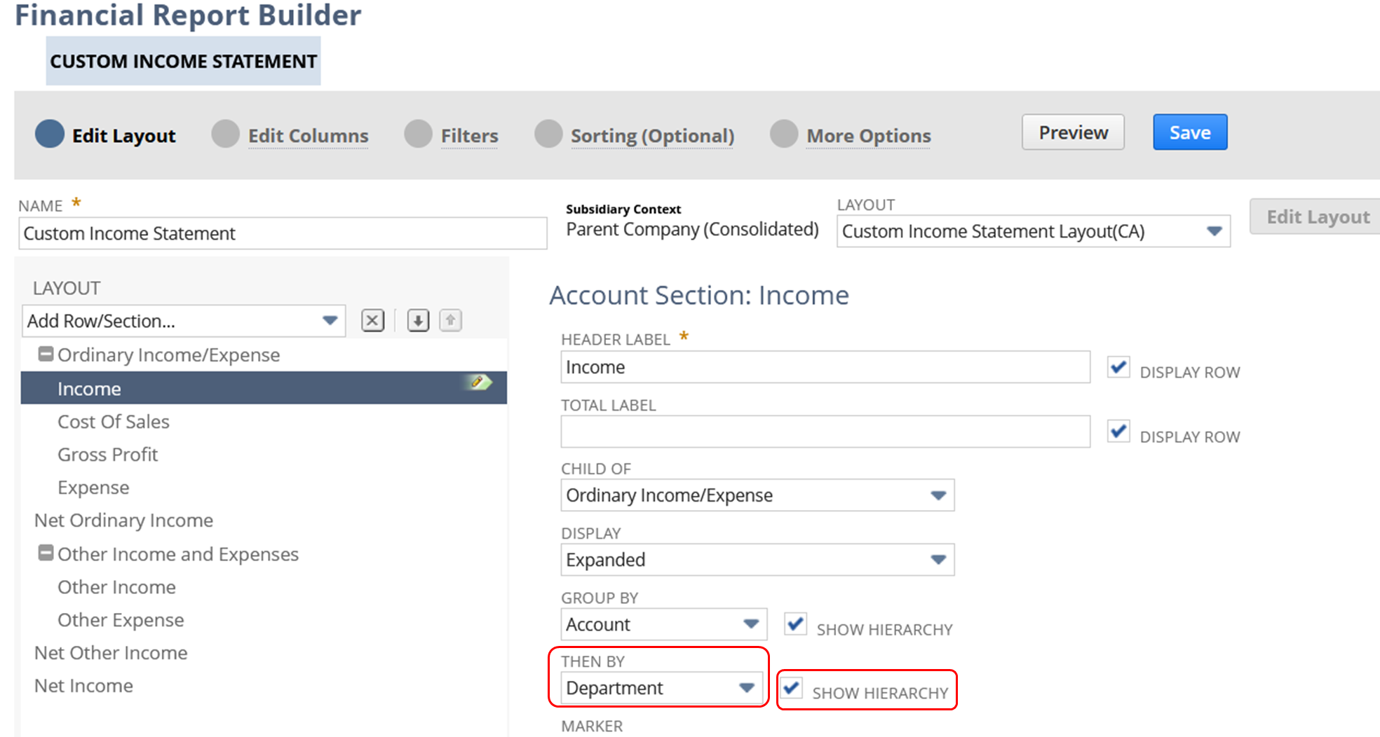 Users can customize Income Statement report to have a subtotal per department group, here’s how: