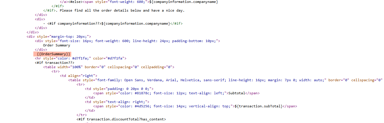 Render the email template and replace the word that you specified in email template. Here, {{OrderSummary}} is replaced with a function